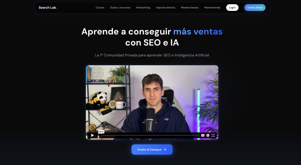 Si hubiera que elegir solo uno, el mejor curso de SEO para 2026 sería el Campus de Search Lab. Nace exactamente para el SEO de esta nueva etapa: una fase donde la visibilidad se gana combinando SEO + IA + automatización. Es una comunidad privada creada por sus cofundadores, Emilio García y Jesús Arias, pensada para aprender con recursos prácticos y actualizaciones constantes.